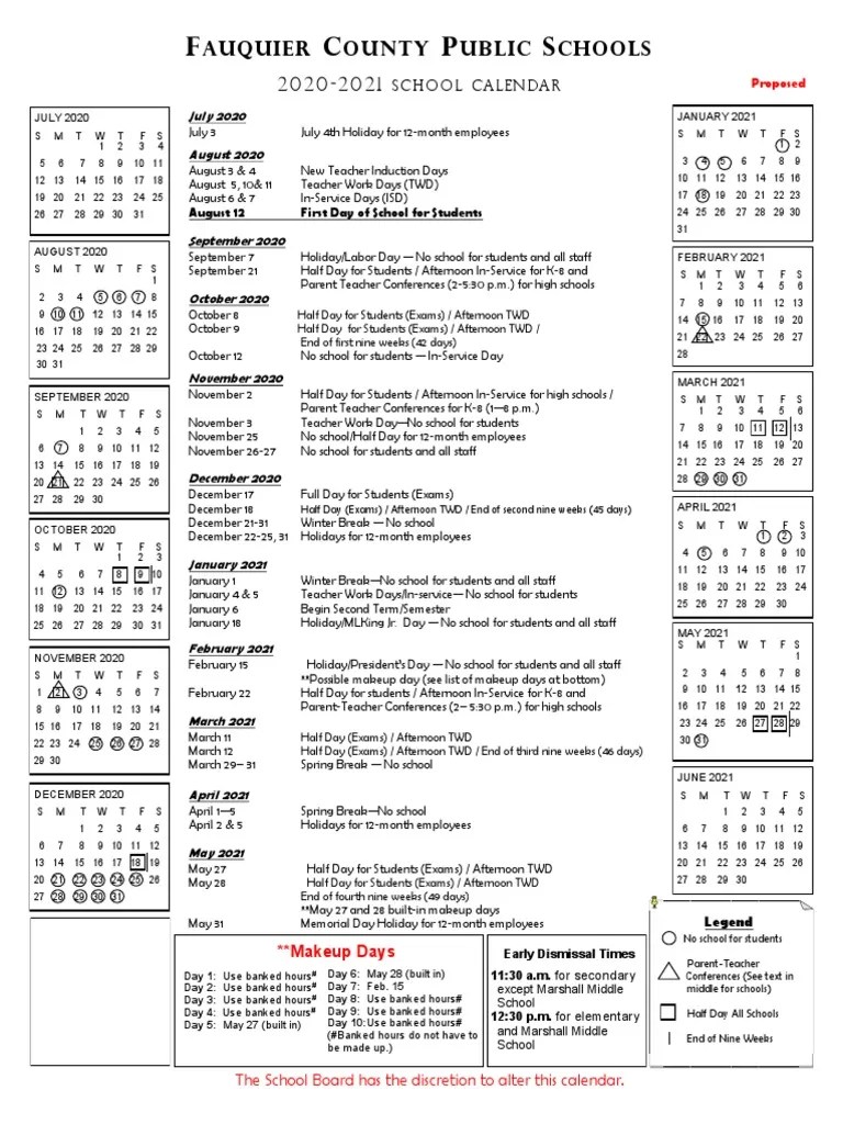 2020 to 2021 Fauquier school calendar Educational Institutions
